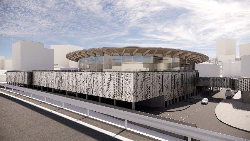 Visionsbild från riktning nordost visar P-husets in- och utfart samt gångbro över gatan. Den glasklädda byggnaden ovanpå p-huset är det nya upplevelsecentrumet World of Volvo. Illustration: Henning Larsen.